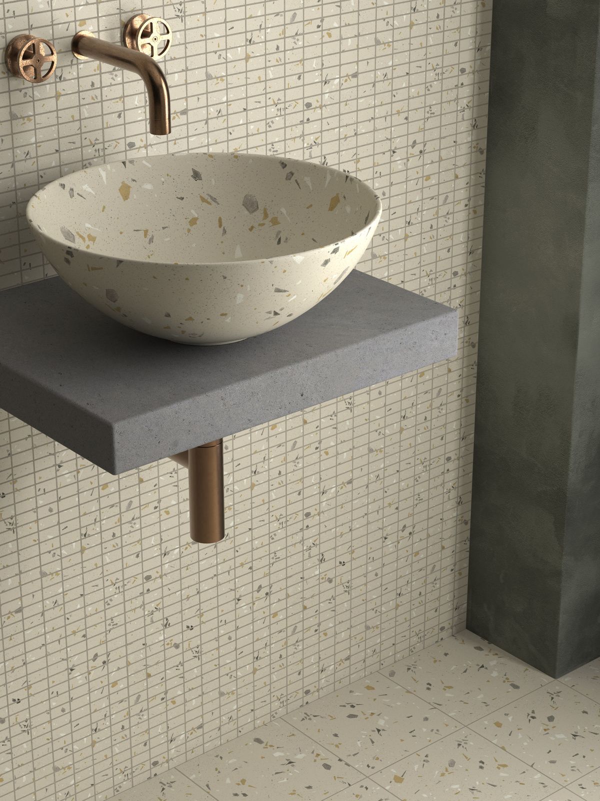 Chaleur et art dans chaque fragment. Redéfinissez vos espaces avec un terrazzo artisanal réinterprété. Ce carreau associe un fond beige chaleureux à des fragments ocre, or et gris peints à la main, créant un effet riche et élégant, tout en contrastes visuels. Sa finition douce et sûre offre un toucher agréable et une sécurité optimale, même dans les pièces humides, unissant design, confort et fonctionnalité. Fragmenta réinvente le terrazzo avec une approche artistique, émotionnelle et artisanale. Chaque pièce a été peinte à la main puis numérisée afin de préserver la richesse du coup de pinceau et la spontanéité du trait. Le design joue avec des fragments de couleur suspendus sur des fonds blancs ou teintés, créant des surfaces vibrantes, originales et profondément humaines. Certains fragments intègrent un léger brillant, qui contraste avec le fond mat et ajoute profondeur, mouvement et richesse visuelle. La collection est complétée par des vasques en céramique peintes à la main dans les mêmes coloris, pour une harmonie parfaite. Fragmenta n'est pas qu'un simple revêtement mural ; c'est une expérience visuelle et sensorielle, où chaque surface raconte sa propre histoire.